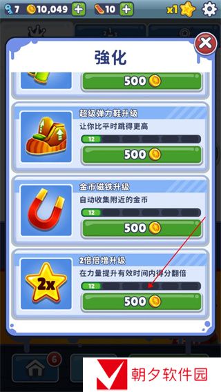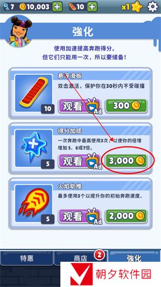 2、方法二:点击商店里的强化,购买“得分加成”后在游戏中使用,可在短时间内提升倍数。