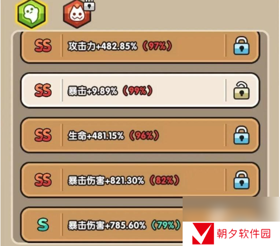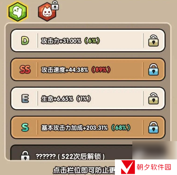 比较常见的属性有攻击力、攻击速度、生命值、基础攻击力加成,不同的属性也有不同的加成。根据加成的高低会E~SS的评价,可以将你看中的属性锁定,这样在洗的时候就不会变成其他属性了。