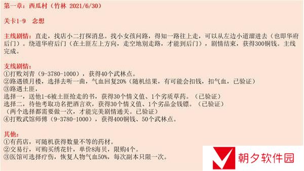 第九关 念想(本关卡需要3次才能完美通关。重置1-6,获取被土匪抢走的书,不还给书生,算一次。1-9对话土匪,两个选项各需要一次。故一共需要3次。不算重置1-6的那一次的话,就是2次,心里有数即可。2021/6/30)提醒:第九关,不完美通关,是因为土匪的两个选择,我们都要经历一遍。选择一,送他1-6被土匪抢走的书,获得30个情义值、1个劣质草药。(已验证)选择二,待他考取功名把酒言欢,获得30个情义值、1个劣品金钱镖。(已验证)(两个选择都需要做一次,才能完美剧情通关。已验证)(文字版)