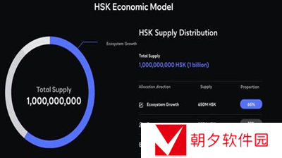 根据官方公布的代币经济模型,HSK是基于ERC-20标准的代币,总供应量为10亿枚,其中65%用于生态建设;30%分配给团队;5%将作为储备基金。