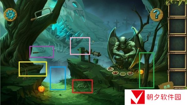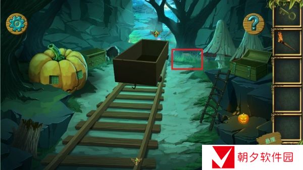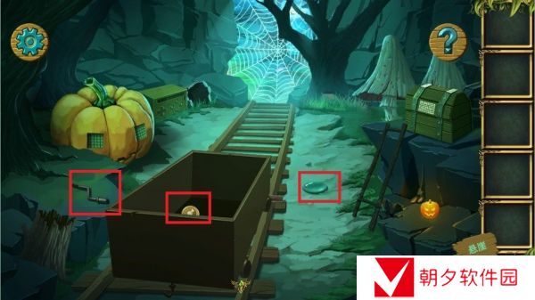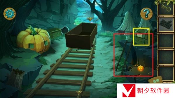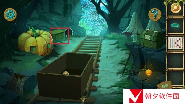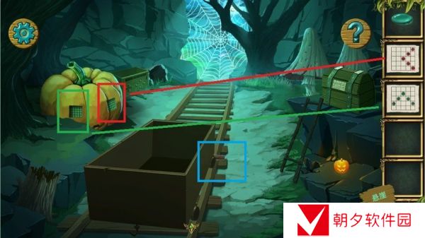 6、再次进入山洞内,左侧南瓜头这里点击两个方块,依照点下方块后显示的颜色,输入对应颜色的纸条的图像,完成后得到南瓜头嘴巴部分的木槌。之后木槌对板车的蓝框处直接使用,板车会把蜘蛛网冲破。进入下一个地图。