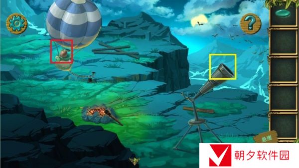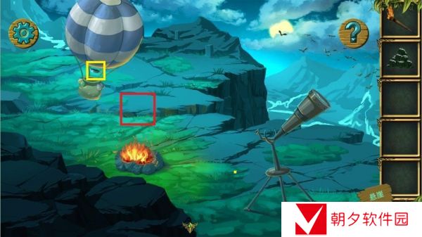 12、前往下图热气球悬崖处,先用钥匙对红框处的铆钉锁使用,热气球成功解锁。然后对黄框处使用热气球燃料,最后用火把对燃料使用把燃料点着。热气球成功启动,点击进入后完成本章节。