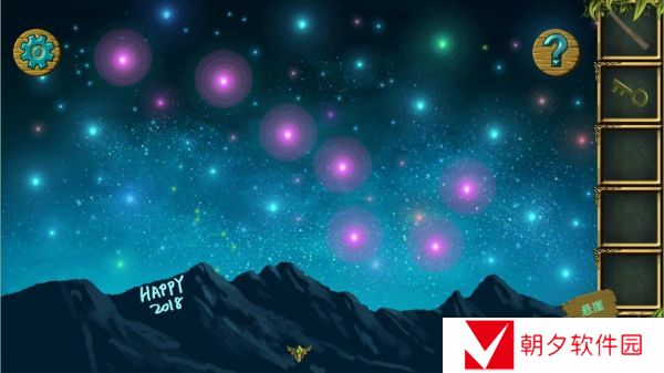 7、首先在红框处热气球篮子里得到苹果。然后在黄框处直接安装之前得到的镜片。顺便把黄框下面地上的斧柄点击获取。点击望远镜后可以看到五颜六色的星星,先不能做什么,然后下面山上有个HAPPY2018的字样,记下,是后续的提示。