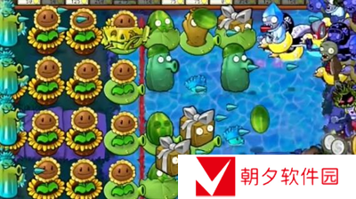 2、先在水池中种植两个寒冰小喷菇,在左侧种植三个受伤的向日葵。